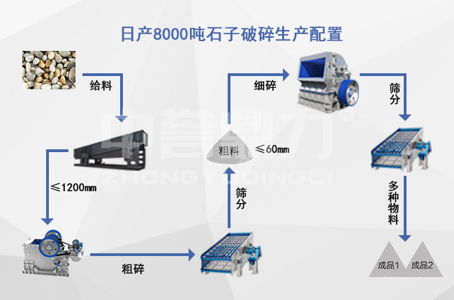 日产8000吨石子破碎生产配置需配置振动给料机、颚式破碎机、反击破碎机、圆振动筛和皮带输送机设备。物料通过给料机进入颚破进行粗破、粗破后的物料进入反击破进行细破、细破后的物料进入振动筛,筛分后的物料送至对应的成品料仓。
