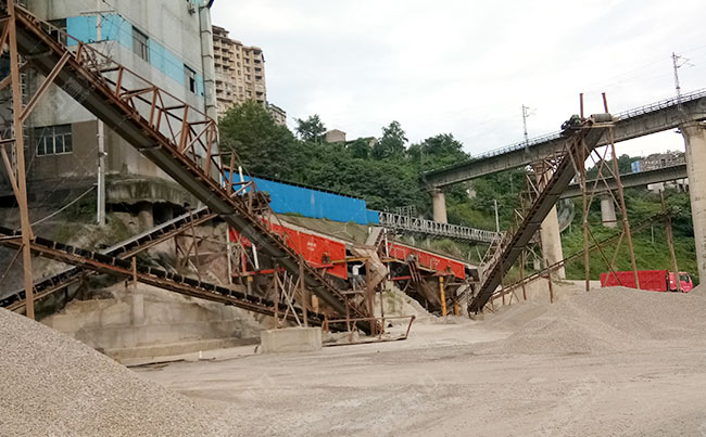 河卵石制砂生产线的筛分现场,破碎后的出料使用皮带机送入圆振动筛进行筛选分级,不符合规格的再返料破碎。