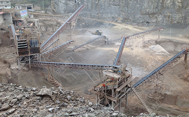 时产500吨石料生产线现场,使用重锤破进行破碎,破碎后的石料进入振动筛进行筛分作业。