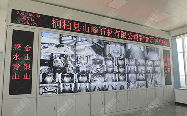 石料厂环保生产线的智能化管理现场,通过屏幕可查看生产线各个现场的工作现场,及时处理相应的情况。
