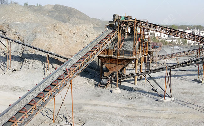 时产400吨生产线的出料现场,使用了皮带输送机将相对应粒形的石料进行输送,送入相应的料堆。