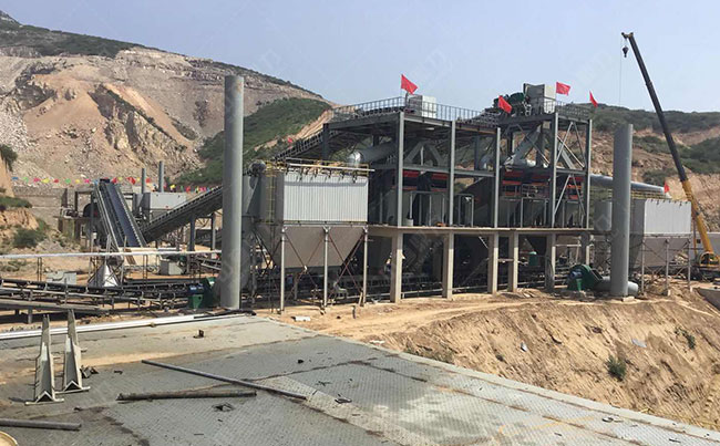 时产1500吨大型砂石料生产线设备安装现场,破碎设备等配置有除尘器进行环保作业。