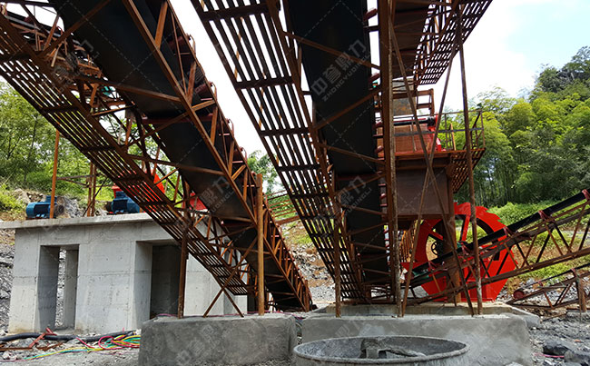 日产1000吨小型石子生产线的洗砂现场,使用了轮钭式洗砂机进行破碎石料的清洗、清洁,处理量大,功率消耗小,洗净度高。