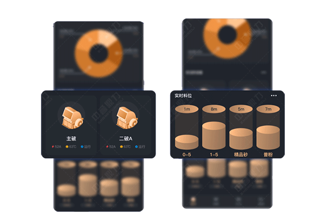 监控矿山生产线程,原料从入口进去到破碎、筛分、制砂、进入料仓等程监控,可感知设备运行状态、成品产量、各料仓库存。可实时检测设备状态,如设备的温度、实际电压、电流、振频等数据。做到生产流程程掌控。