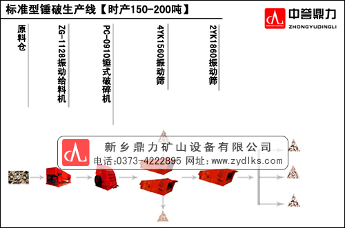 该生产线的设备需要ZG1128、PC0910、4KY1560、2YK1860这四样主要设备,该生产线为在鼎力公司属于小型号配置,该设备特点是可以成本较低,并且功率比较小、应对150-200/吨的时产需求正合适不过,并且锤式破碎机是专业针对破碎石灰石,又称石灰石破碎机,其中振动给料机有着多样性的选择,可有有加长型和漏土双用的选择,并且石灰石破碎机可以根据客户需求增加耐磨护圈,增强耐磨性能,延长使用寿命,其独特锤头制作工艺可以有效破碎物料并且有耐磨和高硬度的特点,独特配备的振动筛稳定筛分合格物料,可以筛分出五种规格的物料,并且可以根据需求进行定制,控制筛网层数和大小。