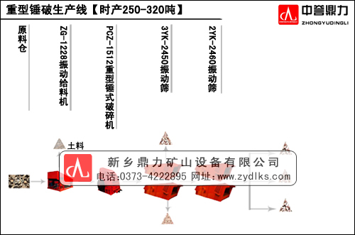 给料系统选择仓下给料机ZG1228,仓下给料机稳定给料,设备性能优越,可以保证长期供应给料,并且可以根据需求,有漏土型,提高物料的洁净度。破碎设备选择重型锤式破碎机PCZ1512,这一型号在新乡鼎力设备中属于中型号的设备,破碎时产范围是250-320吨,进料最大粒度为750mm,该设备由2台160KW电机提供动力。筛分设备则选用两台3YK2450和两台2YK2460,这样合理搭配可以筛分出五种不同规格的成品料,可以根据需求改换筛网,以改变需求物料的粒度大小。