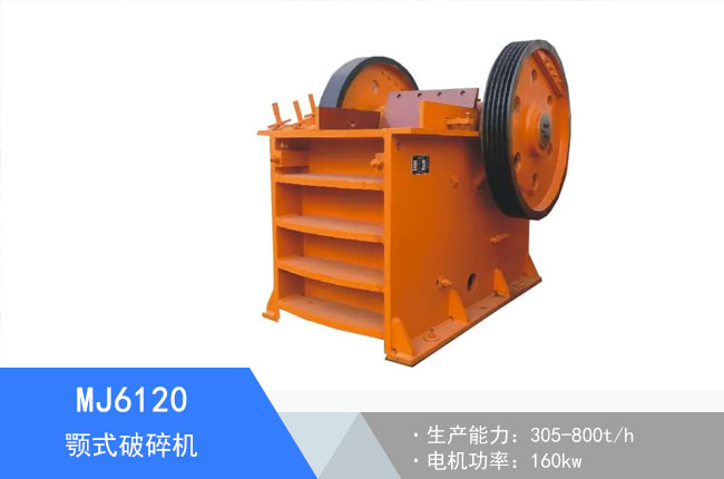 MJ6120颚式破碎机是矿山石料粗碎设备,其参数是进料规格小于1000mm,出料范围在125-275mm间,使用的电机功率是160kw,每小时加工能力是305-800吨,外形规格是3610×2350×3510mm。