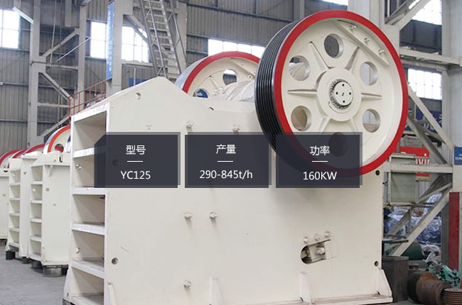 YC125颚式破碎机是一台中大型石料加工设备,参数是进料粒形小于900mm,出料范围在100-250mm之间,采用了一台功率是160kw的电机运行,一个小时的处理量是290-845吨。
